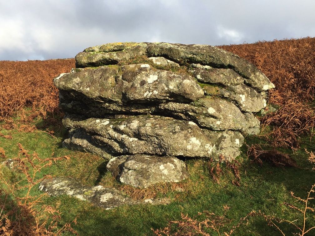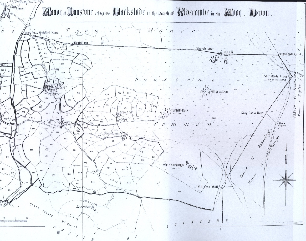 The photo on the right shows the Dunstone and Blackslade Manor boundary stone known as the Shovelstone. It is located about two-thirds of the way up Widecombe Hill on the south side, below Top Tor. You can see its precise location on the map above.