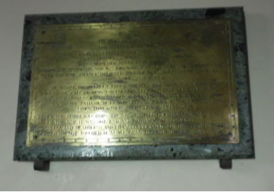 The tablet reads: HE WHOM THIS TABLET COMMEMORATES WAS NUMBERED AMONG THOSE WHO AT THE CALL OF KING AND COUNTRY LEFT ALL THAT WAS DEAR TO THEM. ENDURED HARDNESS, FACED DANGER, AND FINALLY PASSED OUT OF THE SIGHT OF MEN BY THE PATH OF DUTY AND SELF SACRIFICE. GIVING UP THEIR OWN LIVES THAT OTHERS MIGHT LIVE IN FREEDOM. NEVER THE SPIRIT WAS BORN, THE SPIRIT SHALL CEASE TO BE NEVER; NEVER THE TIME WAS NOT END AND BEGINNING ARE DREAMS; BIRTHLESS AND DEATHLESS AND CHANGELESS REMAINETH THE SPIRIT FOR EVER. DEATH HATH NOT TOUCHED IT AT ALL. DEAD THOUGH THE HOUSE OF IT SEEMS.
