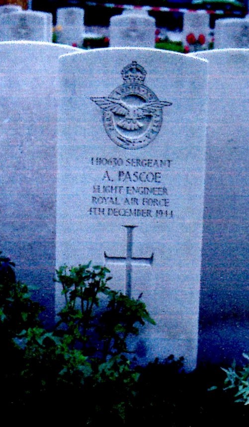 Sgt A.A. Pascoe trained as a flight engineer with 619 Squadron stationed at RAF Strubby in Lincolnshire and flying Lancaster Mk111 bombers. On the night of Monday 4th December 1944 his aircraft took off to take part on a bomber raid on Munich in Southern Germany leaving RAF Strubby at 16.42hrs. The plane was shot down by Obit Peter Spoden of the Luftwaffe at 19.38hrs 45 miles south of Munich.