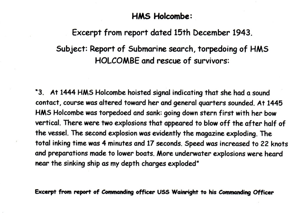 Another escort vessel U.S.S. Wainwright rescued the remaining 87 of Holcombe’s crew. U-Boat 593 was sunk the following day by U.S.S Wainwright and HMS Calpe.